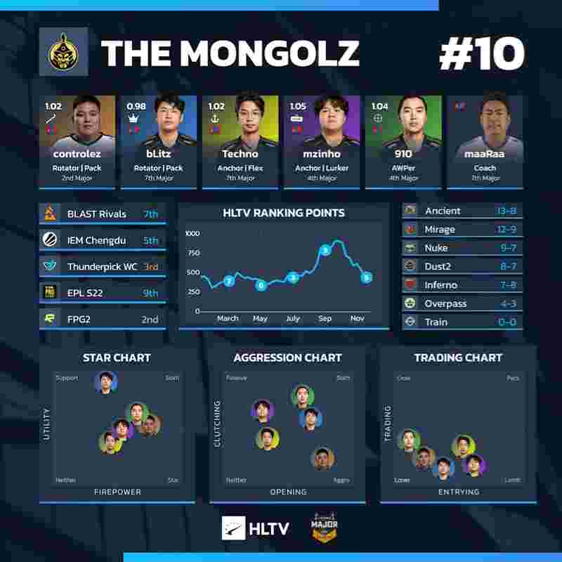The MongolZ在强图Mirage上的表现有所下滑:过去三个月的BO3/BO5中,他们有2/3的概率会选择Mirage,但战绩仅为6胜7负(负场多于胜场)。