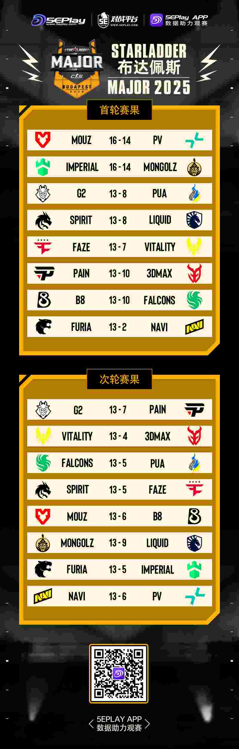 Spirit、MOUZ、FURIA轻松进入2-0小组,FaZe、Vitality、Falcons、MongolZ、NAVI也稳定在1-1小组,Liquid在经历了第二阶段的0-2开局后上演经典重现。