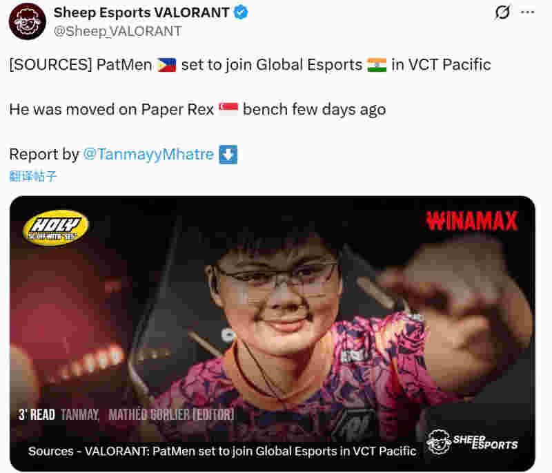 PatMen在经历了一个非常成功的新人赛季后,将继续征战VCT联赛。他在新人赛季的表现一直非常稳定。他将加入在休赛期异常活跃的GE,该战队也明确表达了他们对下赛季的雄心壮志。