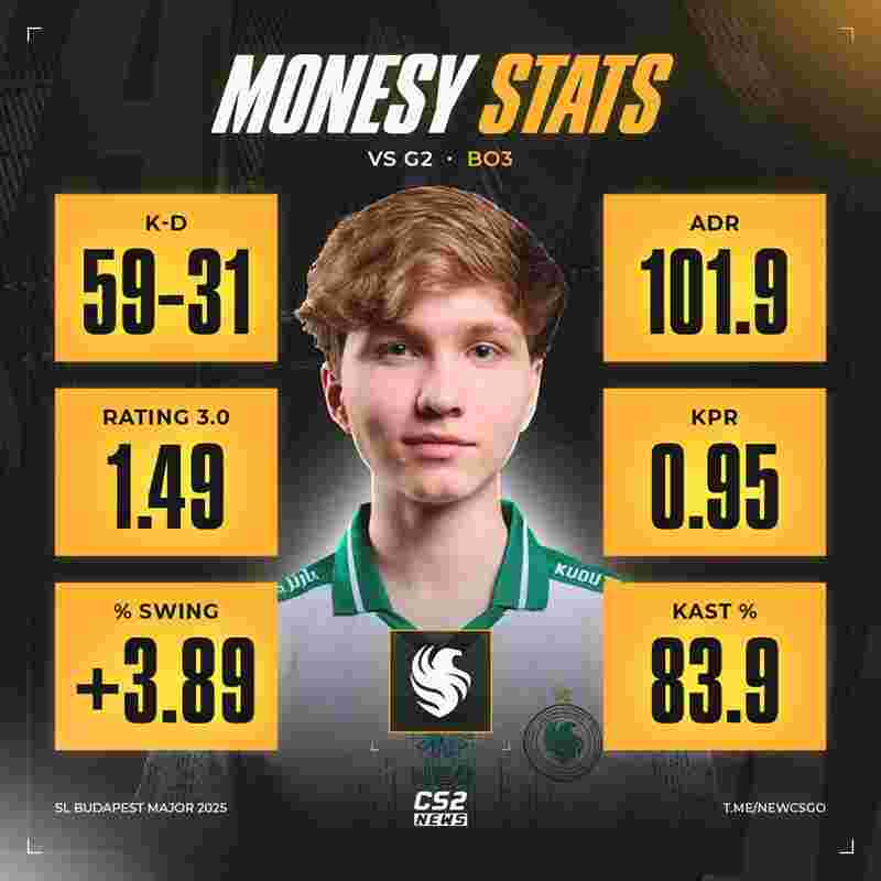 在这场决定命运的生死战中,m0NESY砍下了59-31的K/D数据,场均伤害(ADR)突破101.9,最终Rating定格在惊人的1.49,是全场发挥最出色的选手。