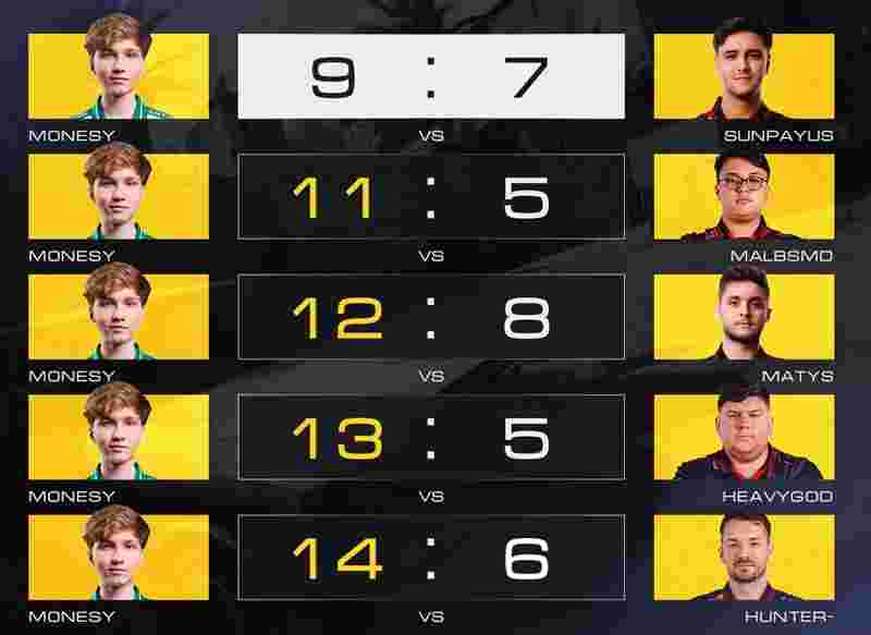 更令人绝望的是,m0NESY在与G2所有选手的直接对位中,全部取得了胜利,面对huNter-,m0NESY更是打出了14:6的碾压战绩。面对HeavyGod(13:5)和malbsMd(11:5),他也现了全方位的压制。即便面对G2现任狙击手SunPayus,他也以9:7占据上风。