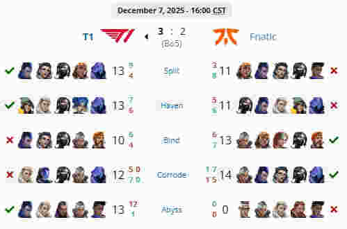 FNATIC,T1在先下两城的情况下,被FNC连扳两图。