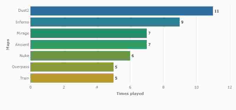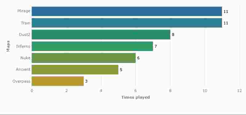 其中,图池中攻守最为平衡的地图是Inferno,CT方胜率为50.8%,T方胜率为49.2%。而最不平衡的地图为Nuke,CT方胜率为58.7%,T方胜率为41.3%。除此之外,所有地图中除Ancient外,CT方胜率均高于T方。而在选图方面,各大战队似乎都更热衷于选用“老三张”地图,其中Dust2和Mirage以27场选用并列第一,Inferno以24场选用排在第二,而Overpass则以13场选用垫底。