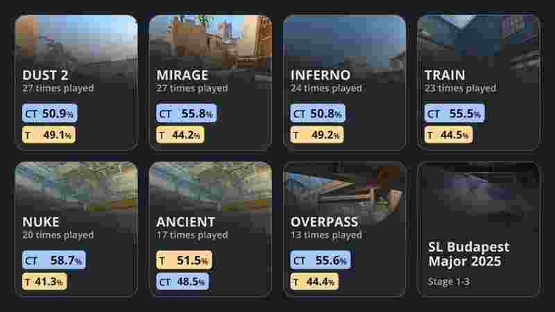 在布达佩斯Major第一阶段中,Mirage以9场选用占据第一,Dust2、Nuke、Inferno则以8场并列第二。而在第一阶段,Mirage、Nuke、Overpass、Train的CT胜率居高不下,其中Train以高达62.6%的CT胜率成为玩家口中的大CT图。