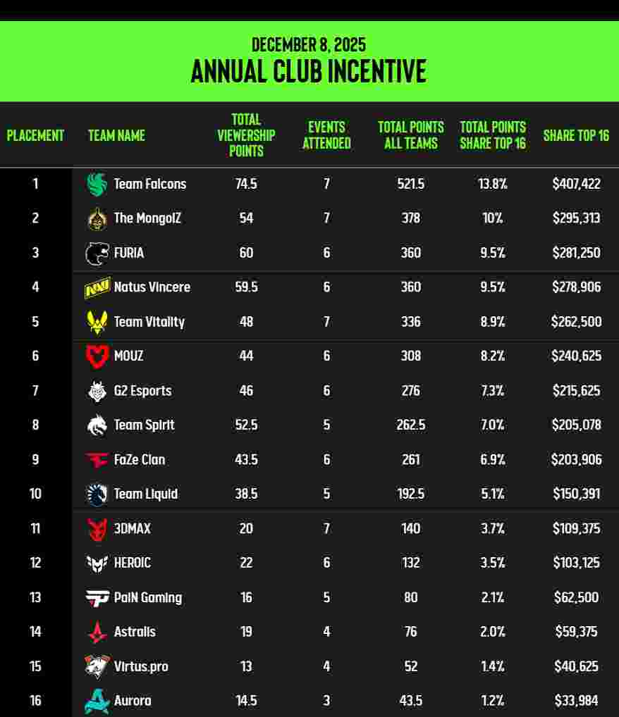 IEM成都站作为2025年最后一站赛事,分配了剩余的108个收视积分。赛事参与次数是影响排名的最后一项因素,它再次倾向于那些在2025年持续参与我们赛事的战队。综合以上因素,2025年度俱乐部激励计划的最终排名已确定。本年度共有42家俱乐部参与排名,总奖金2,950,000美元将根据排名前16战队在总积分中的占比进行分配。