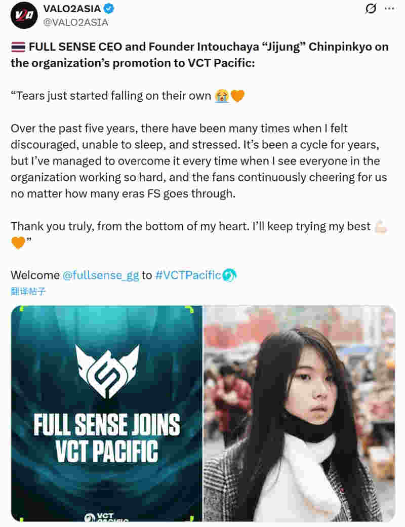 FULL SENSE战队CEO Intouchaya Chinpinkyo发文,大意如下: