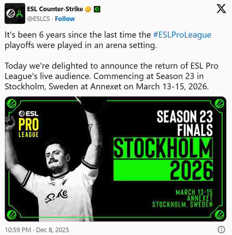 EPL S23主办方宣布,本届赛事的淘汰赛阶段将重回实体场馆举办。赛事运营方已通过官方社交媒体账号发布该消息,而上一次EPL在实体场馆举办赛事已是六年前。