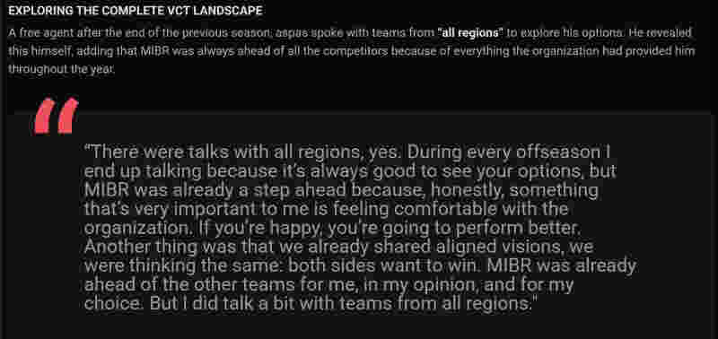 还有一点就是我们的愿景很契合,我们的想法一致——双方都想赢。在我看来,MIBR已经领先于其他队伍,也符合我的选择。不过,我确实跟所有赛区的队伍都聊过一下。