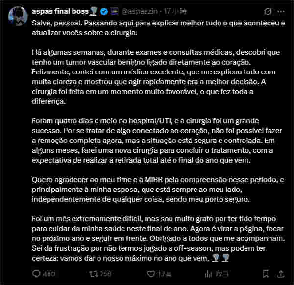 Erick Santos | aspas发文更新自己的手术情况,大意如下: