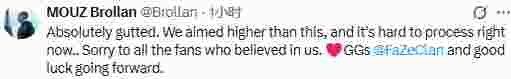 Brollan:心碎至极。我们本有更高的目标,此刻实在难以接受……向所有相信我们的粉丝致歉。GG FaZe,祝你们接下来好运。