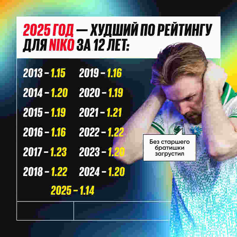 NiKo的2025年个人职业Rating定格在1.14,创下其12年职业生涯的最低纪录。