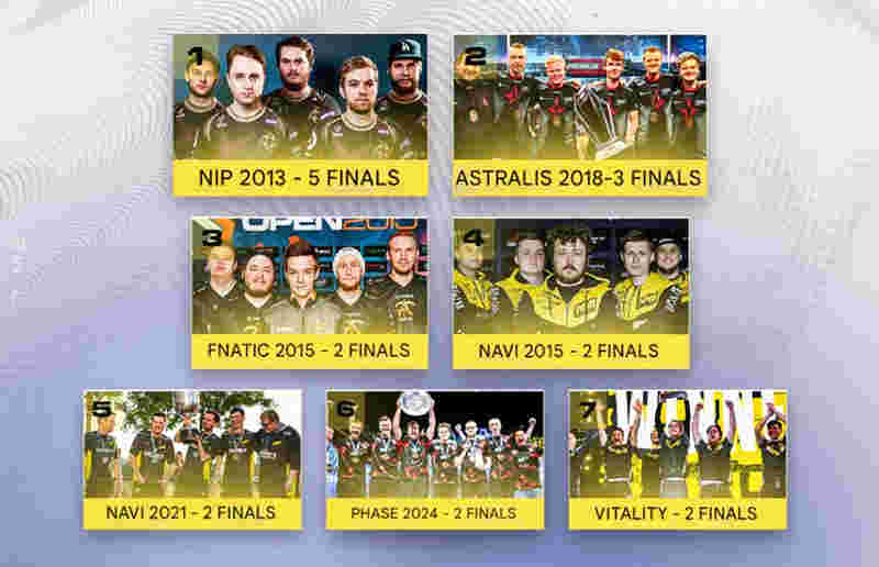 Spirit的5次,展现了独一档的稳定性。同时,他们也成为了历史上第7支连续闯入两届Major决赛的队伍。对于这支法国豪门而言,今晚不再仅仅是关于证明自己,而是一场通往“王朝”的加冕礼——如果获胜,他们将达成两项史诗级成就:不仅将成为第一支在CS2时代实现Major背靠背夺冠的队伍,更将成为继