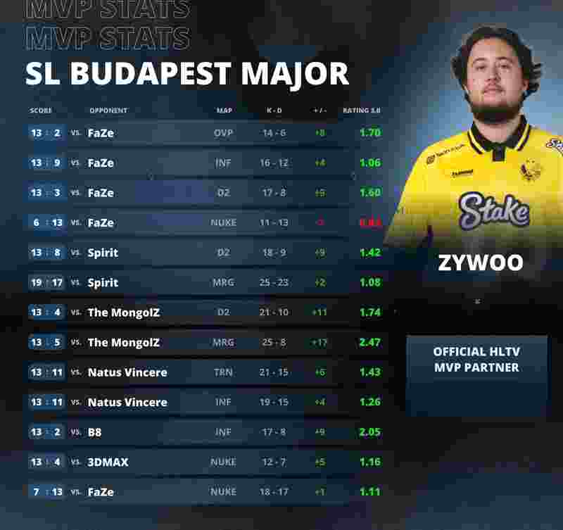 在布达佩斯Major赛事期间,ZywOo带领队伍出战了13张地图,其中仅在总决赛对阵