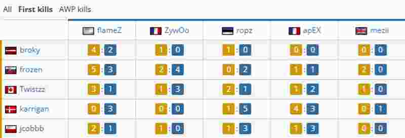 首杀数据上,ropz为队伍拿下全场最多的11次首杀,而FaZe一方首杀最多的选手是frozen,为10个首杀。