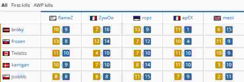 在全部对位数据上,本次赛事MVP ZywOo展示出了自己强大的实力。除了面对jcobbb处于8-8的平手之外,面对其它FaZe选手均处于上风,对位Twistzz打出10-4的数据。另外,“英一步”mezii也表现不俗,面对jcobbb和broky分别打出11-2和15-6的对位数据。