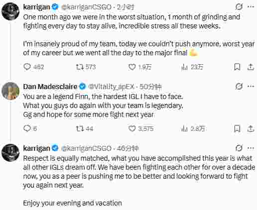 karrigan回复:这份敬意是相互的。你今年所取得的成就,是所有其他指挥梦寐以求的。我们彼此较量已超过十年,有你这样的对手在鞭策我不断进步。期待明年再次与你交锋。享受你的夜晚和假期吧。
