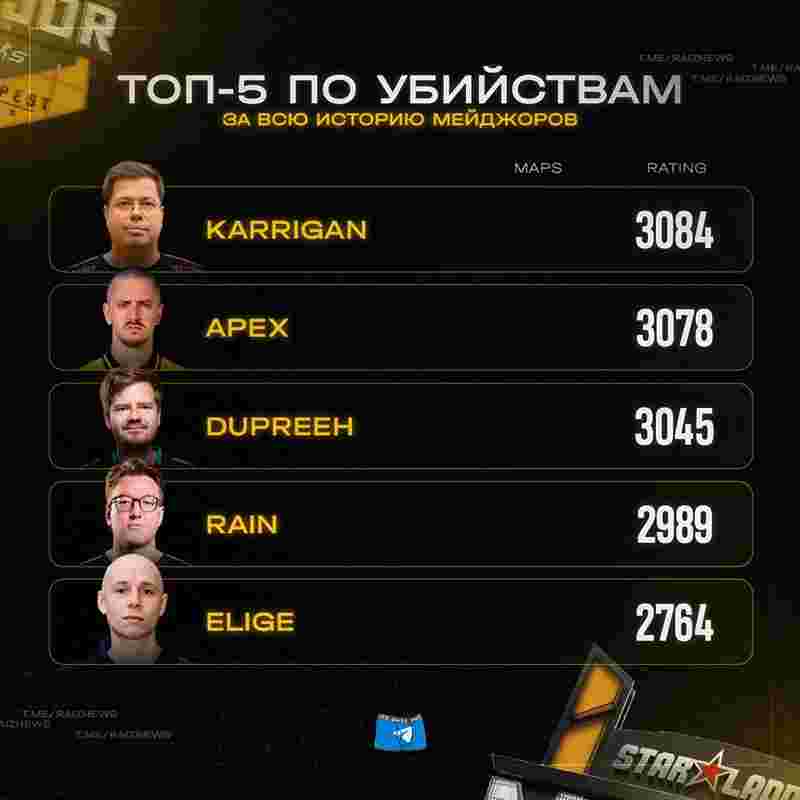 FaZe战队指挥karrigan以3084个击杀的数据位居榜首,成为Major赛场击杀最多的选手。