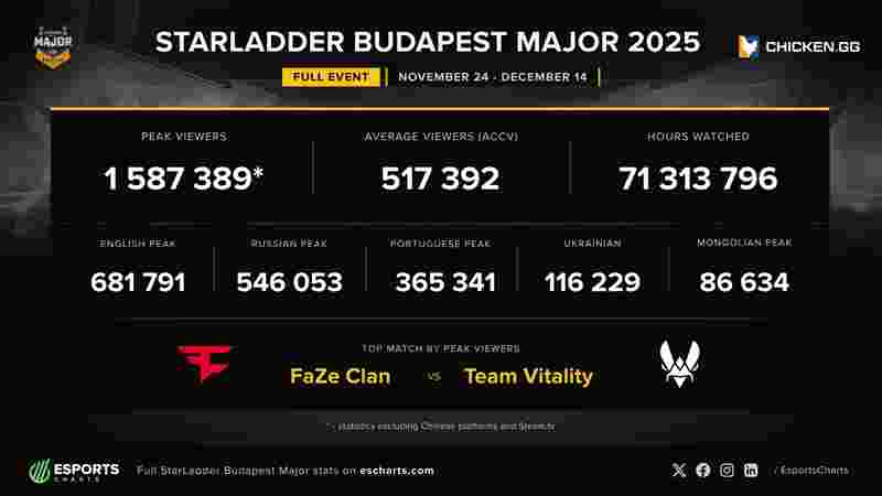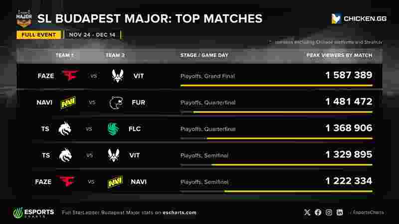 FaZe夺冠,其决赛峰值观众达到1,587,389人。这一数据让本届Major成功跻身CS赛事历史收视榜第五位。
