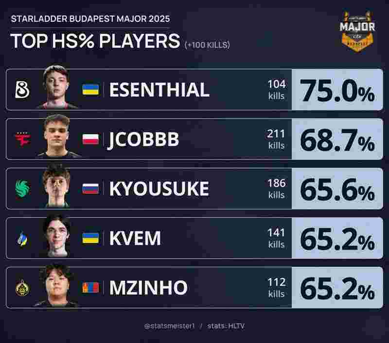 在本届布达佩斯Major结束后,外媒统计了全阶段选手的爆头率及爆头击杀数。
