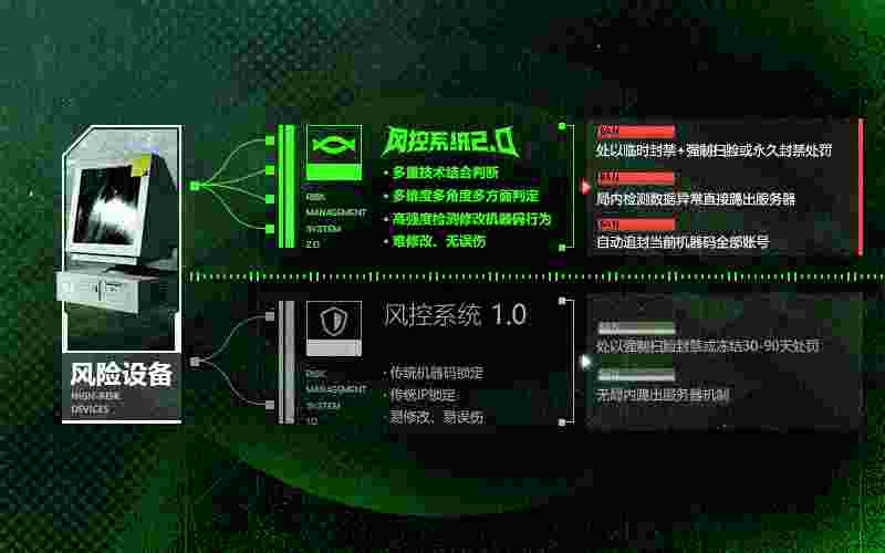 若有玩家在被风控系统识别为作弊机器上进行登录,会受到和作弊封禁等同的踢出服务器处罚,同时也会按照情节严重程度对账号进行临时封禁+强制扫脸认证;
