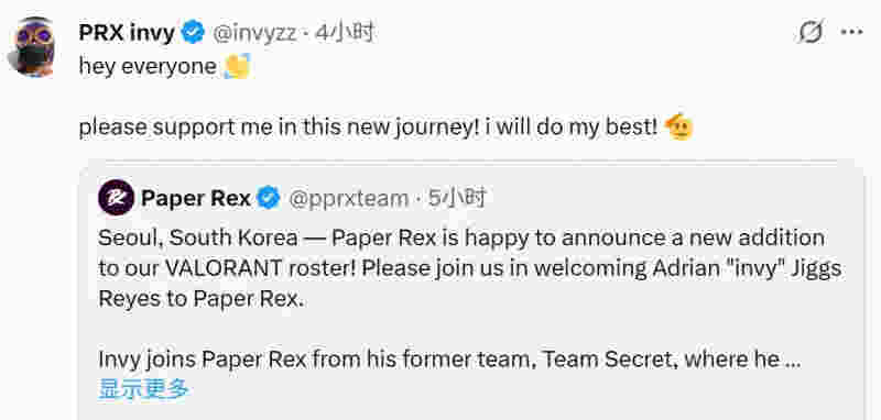 在PRX官宣invy加入队伍后,invy发文:大家好,请大家多多支持踏上新旅程的我吧!我会尽我最大努力做好的!