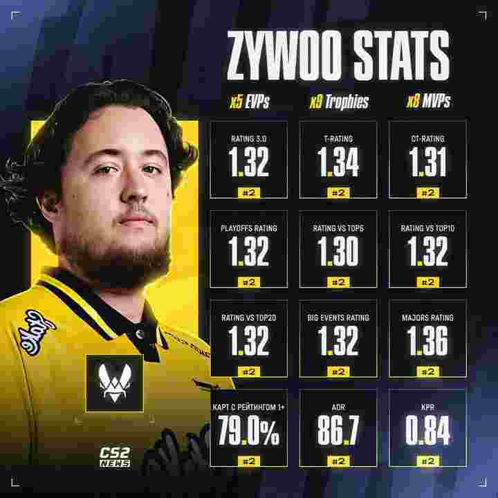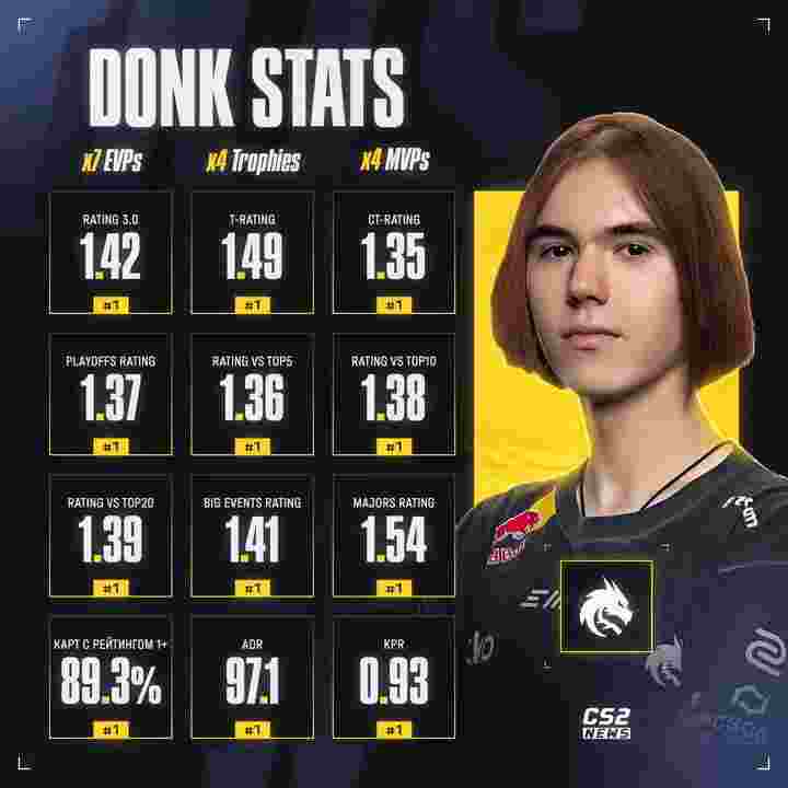Vitality的卫冕成功落下帷幕以后,今年所有顶级赛事全部宣告结束。根据全年统计数据来看,donk数据当之无愧为第一,ZywOo在各项数据中均位列第二。