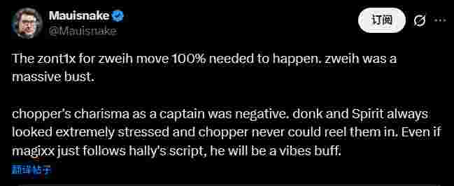 Spirit的最新阵容调整时说道:“关于zont1x替换zweih的决策是百分百必要的。zweih的引进是Spirit彻头彻尾的败笔。同时,作为指挥,chopper的领导魅力简直为负值。donk和Spirit始终背负着巨大压力,而chopper在比赛过程中完全无法稳住他们的心态。magixx接任指挥后哪怕只是照搬hally的战术手册,他也能为团队带来士气上的提升。”