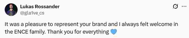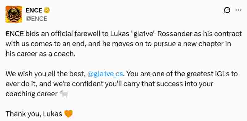 ENCE战队在x上发推官宣,与gla1ve的合同宣告正式结束:“随着与俱乐部合同的到期,ENCE正式与gla1ve告别,他将以教练身份开启职业生涯的新篇章。