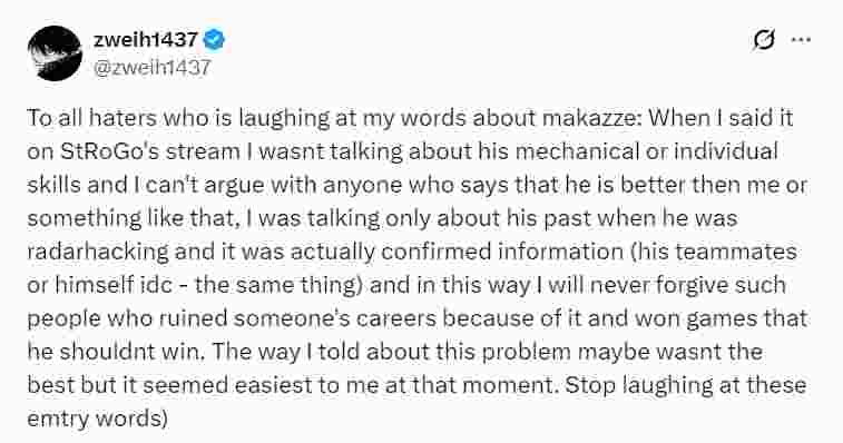 “所有嘲笑我关于makazze言论的黑子听着:当初我在StRoGo的直播里说这番话时,根本不是在谈论他的枪法操作或是个人实力。要是有人说他比我强之类的话,我完全无从反驳。