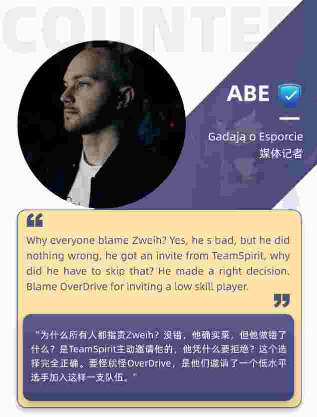Spirit下放zweih和chopper的新闻显然是今日全球CS玩家讨论最热门的话题,同时,我们也留意到,无论国内外的评论家们,意见竟都出奇的一致,将对于Spirit成绩的不满对准了年轻小将zweih。独联体地区波兰媒体人ABE此时表达了另一种观点,在他看来,zweih虽然表现不佳,但真正该为此担责的人却应该是Team Spirit的星探OverDrive。