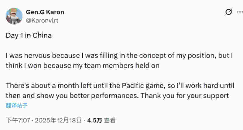 Karon:在中国的第一天。我真的很紧张,因为我要填补这个位置的空缺。其实我觉得赢下来是因为我队友们的坚持。距离太平洋联赛开赛还有大概一个月的时间,在那之前我会努力训练,争取为大家带来更好的表现。感谢大家的支持。
