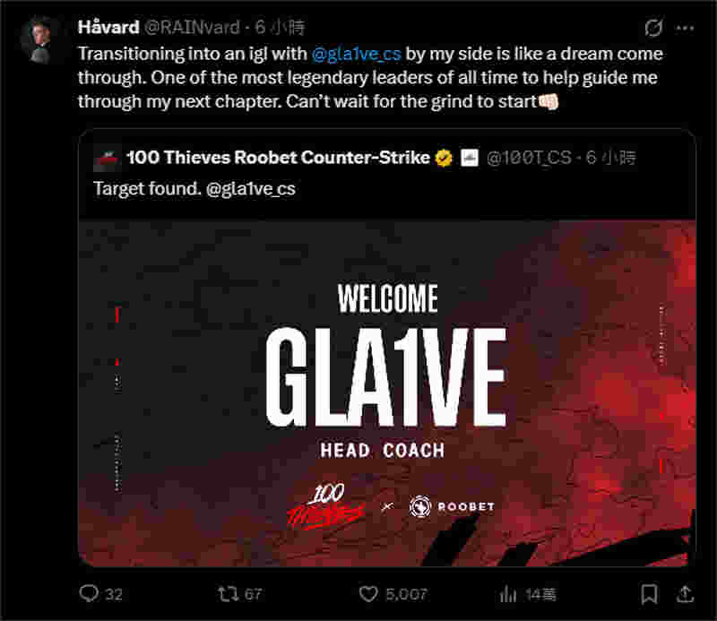 在100 Thieves发布官宣后,rain也第一时间在社交平台转发并表达了对gla1ve的欢迎和对未来的期待: