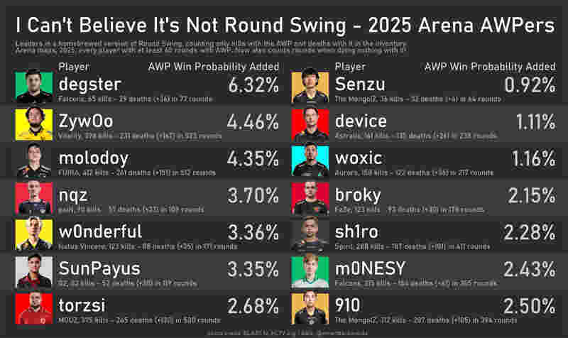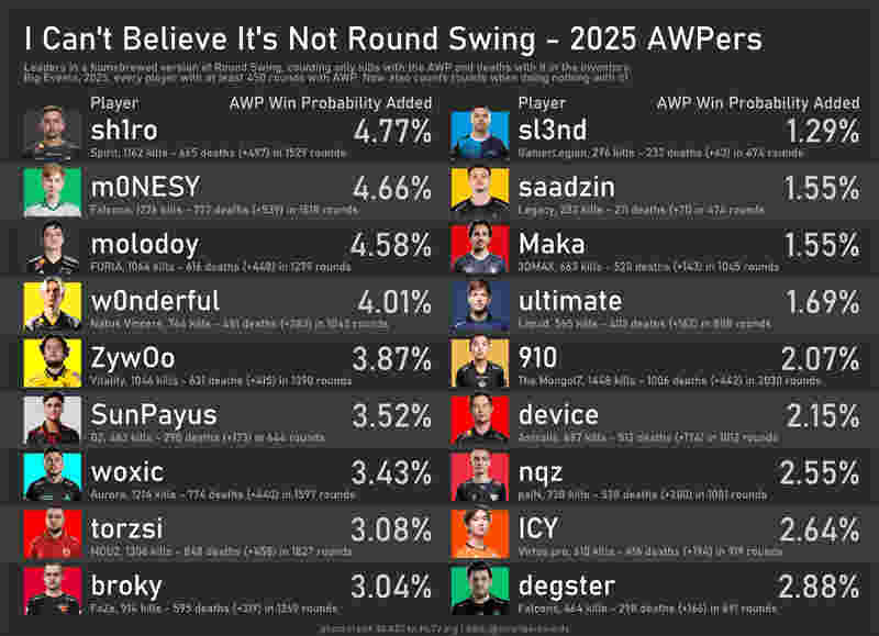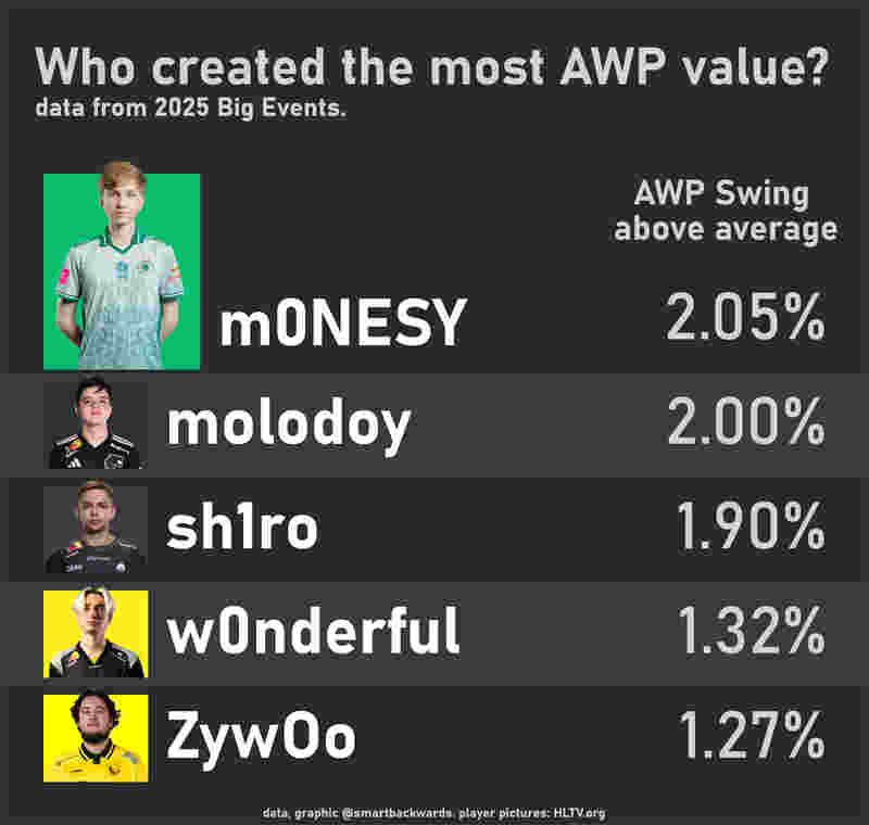 在持续追踪分析全年大型赛事DEMO的基础上,我构建了一套独立的“AWP回合影响力”统计模型。该模型专注于量化选手在持有AWP且回合中出现击杀或死亡的回合中对比赛胜率的影响。