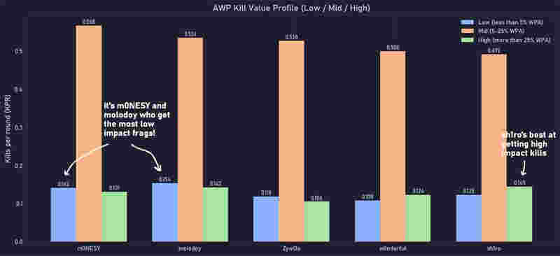 高质量击杀:sh1ro更擅长完成对回合胜率产生决定性影响的“关键击杀”(在模型定义中影响力极高),其表现是前五选手中最好的。相比之下,m0NESY和molodoy的击杀更多集中于对胜率影响较小(≤5%)的场合。