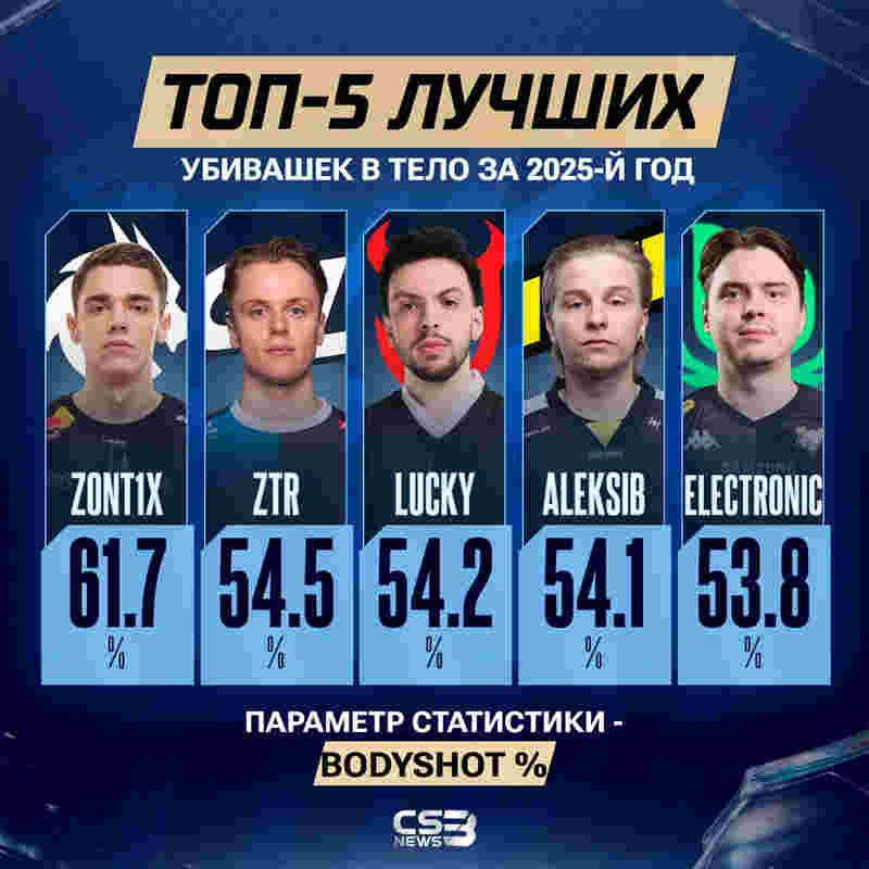 外媒CS3NEWS统计了2025年身体击杀占比前五的选手,其中zont1x以61.7%的非爆头击杀率(1403总击杀,865非爆头击杀)位居榜首。