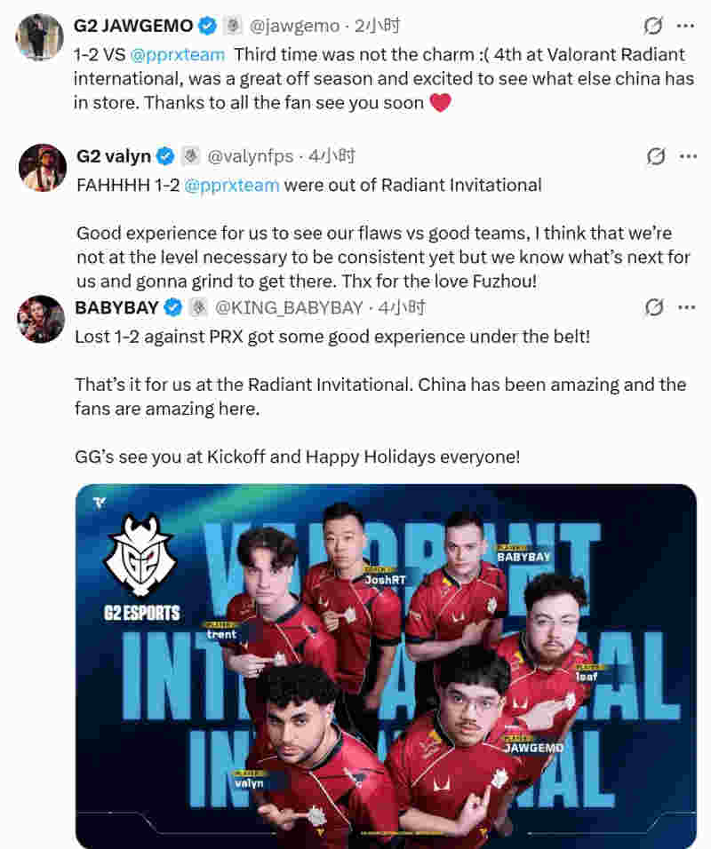 Paper Rex止步第四名,赛后G2选手们发文: