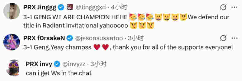 Gen.G,获得冠军。赛后PRX选手们发文: