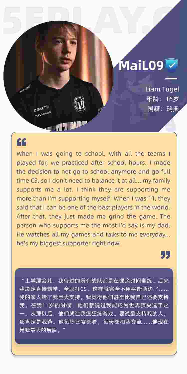 MaiL09在2023年开始加入青训战队,2025年7月正式加入瑞典一线战队Metizport,在随Metizport征战的半年时间里,MaiL09保持了1.08的个人平均Rating。而MaiL09更加为人熟悉的还是他在欧洲天梯上的表现,近年来,他多次打破donk在欧洲天梯上的记录,截至目前为止,MaiL09已经三次夺得FPL欧洲冠军。
