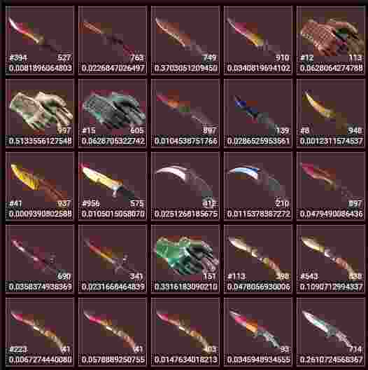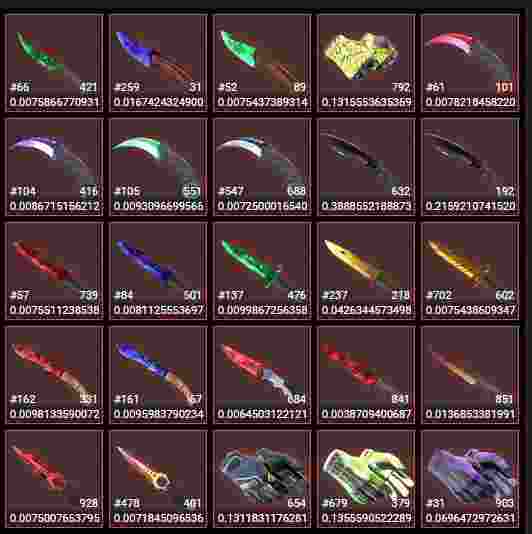 22把具有罕见图案的刀具,包括★蝴蝶刀、★爪子刀、★M9刺刀等顶级型号;