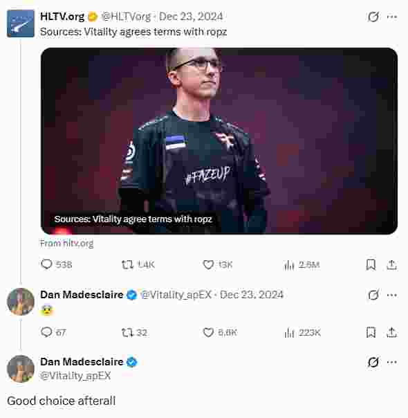 时隔一年,apEX再次提起了关于“世一自”ropz转会Vitality的帖子。
