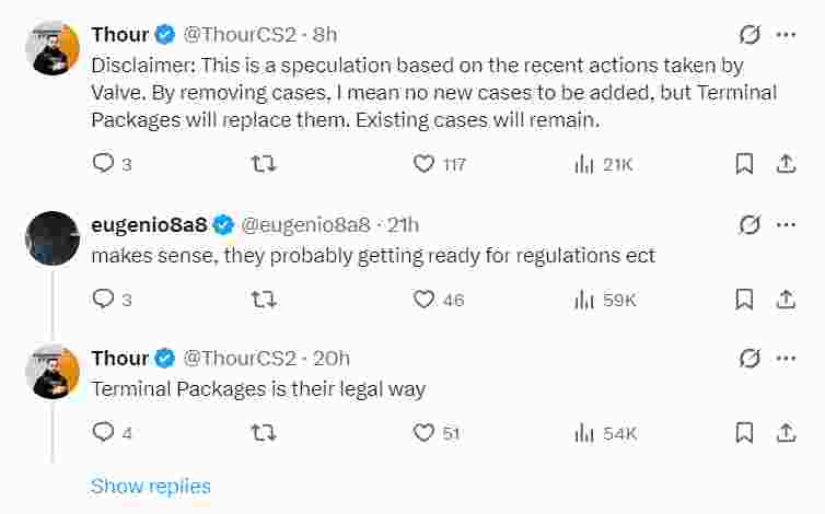 随后ThourCS又在该帖子发布声明:“本文所指移除武器箱,意为未来将不再新增武器箱,取而代之的是终端机礼包,现有武器箱将保留。终端机礼包其实不过是换汤不换药,V社为了规避监管罢了。”