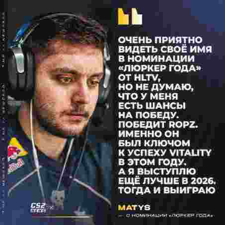 MATYS表示:“很高兴看到我的名字出现在HLTV‘年度自由人’提名中,但我认为我没有获胜的机会,获胜的会是ropz。他正是