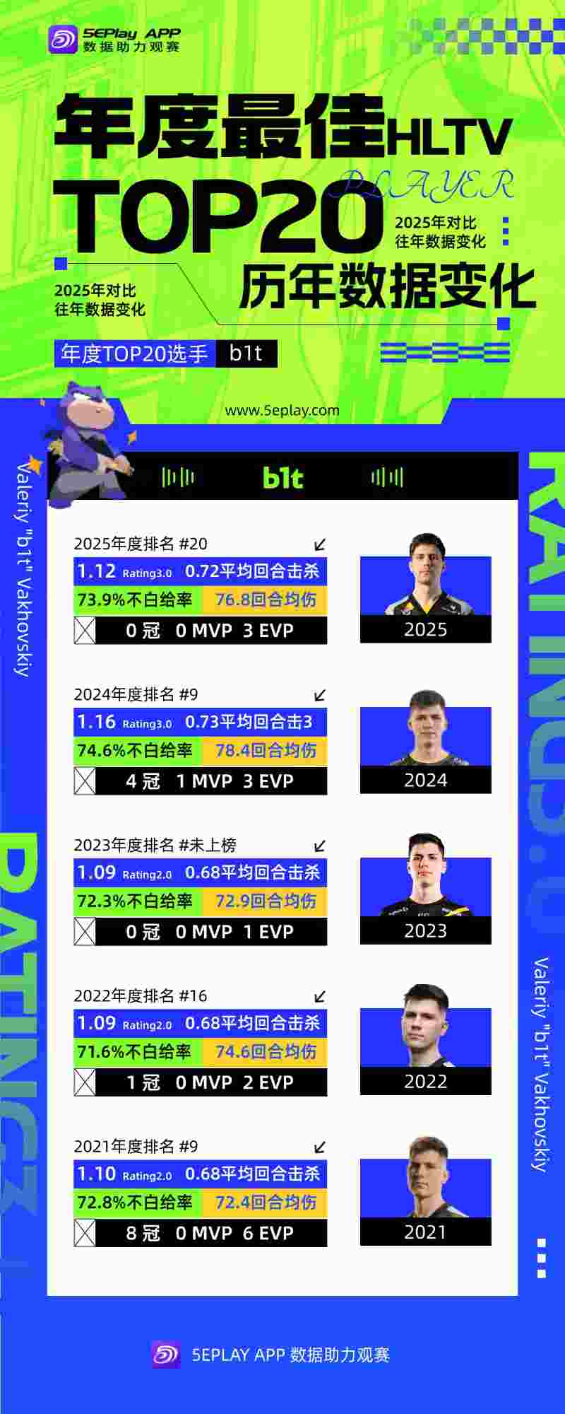 b1t荣获了HLTV在今日凌晨公布的2025年度最佳选手第二十名。这是他五年来第四次跻身年度最佳选手TOP20榜单。