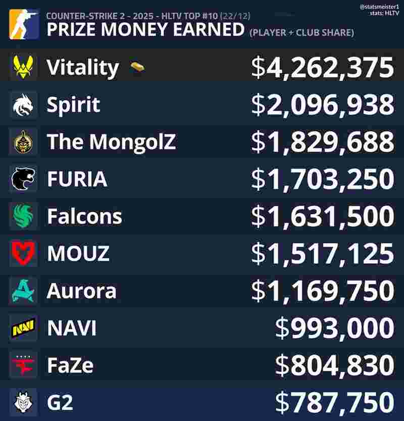 外媒对今年TOP10战队全年奖金金额进行了统计,以下是2025年HLTV排名TOP10战队今年奖金收入排名: