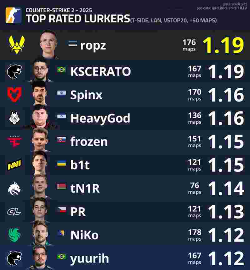 本榜单仅统计进攻方,基于线下赛事、对阵TOP20队伍、地图量50+数据样本。ropz以1.19 Rating成功登顶,KSCERATO以微弱的地图数量差距位列第二。Spinx、HeavyGod和frozen紧随其后。