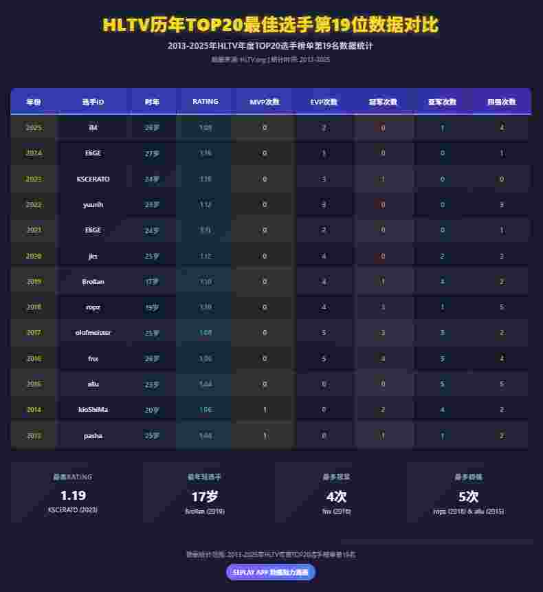5EPlay在此整理出了自2013年至今每一年的TOP19选手名单,一起来看看哪一年的上榜难度最高吧。