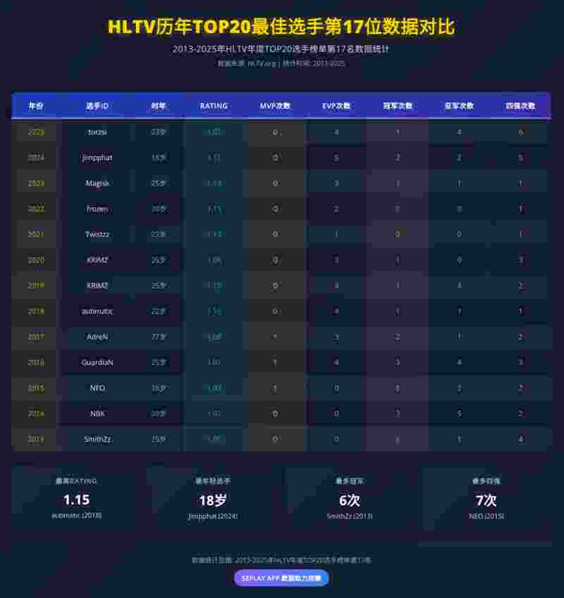 MOUZ NXT被提拔到一队后已在MOUZ效力四年,这也是他第二次登上HLTV TOP20的榜单。那么,从2013年至今,历史上每年TOP20榜单第17位的选手们数据又是如何?
