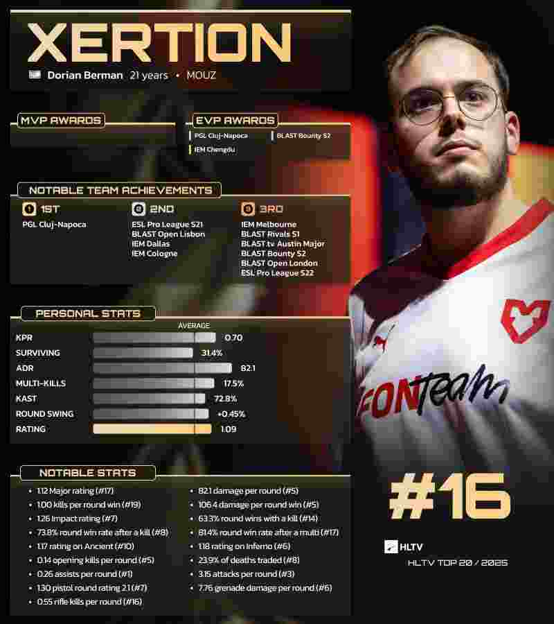 在2024年崭露头角并首次跻身年度TOP20选手榜单后,xertioN凭借持续深入赛事并与世界顶尖战队交锋的表现,于2025年再度蝉联该荣誉。尽管状态起伏曾导致一些低谷,但他在大型赛事中的表现仍证明其强劲实力:两度收获大型赛事EVP奖项(其中一次来自精英赛事IEM成都),同时在BLAST.tv奥斯汀Major与IEM科隆中数次与荣誉擦肩而过,在StarLadder布达佩斯站亦有稳定发挥。