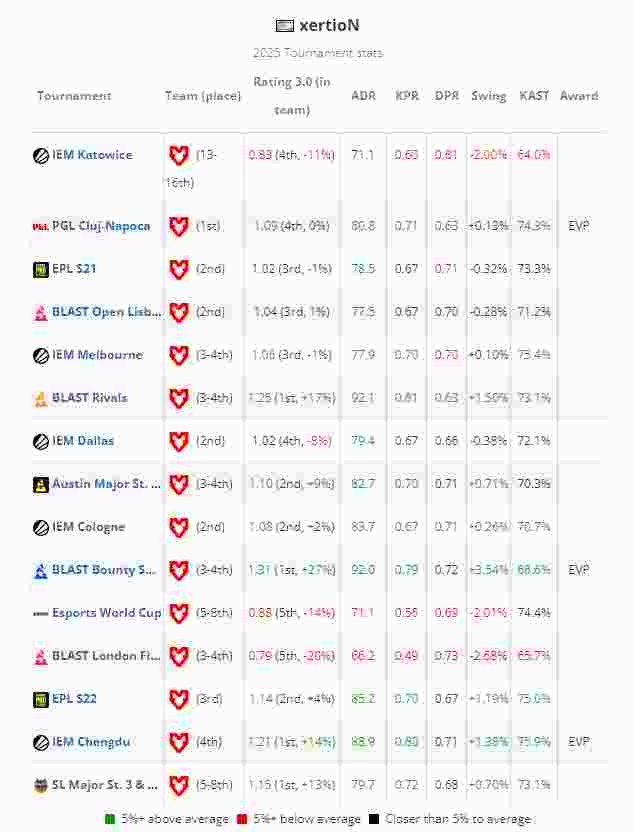 xertioN在2025年的两届Major赛事中以1.12的平均Rating位列所有选手第17名
