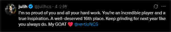 xertioN的妻子,同时也是巴西CS女职业选手的julih则是少数的支持者,她发文祝贺:我为你和你的所有努力感到无比骄傲。你是一位出色的选手,也是真正的榜样。第16名实至名归。请像往常一样,继续为来年拼搏。我心目中的史上最佳!